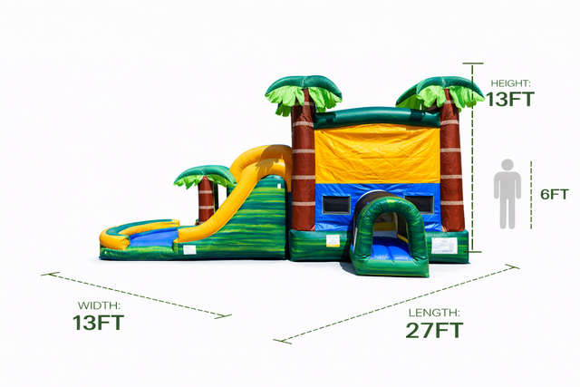Introducing the Cali Palms Dual Lane Bounce House, a versatile and exciting addition to any event or party. This inflatable attraction offers both wet and dry options, making it perfect for year-round fun. Featuring vibrant palm tree graphics and a tropical theme, it brings a splash of paradise to any gathering.